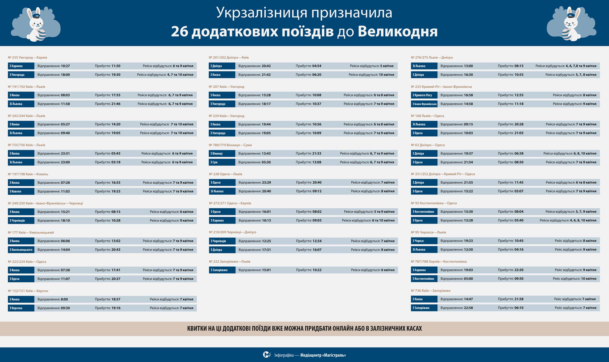 Зокрема, поїзд №239 Київ-Ужгород відправиться з Києва 6, 8 квітня о 19:44 і прибуде в Ужгород наступного дня о 10:56. У зворотному напрямку відправлення з Ужгорода 7 і 9 квітня в 19:05 та прибуватиме до Києва наступного дня о 10:09.