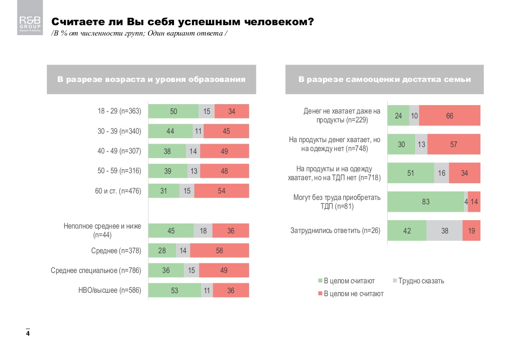 Як зазначають соціологи, із збільшенням віку опитаних має місце деяке зниження питомої ваги тих, хто вважає себе в цілому успішною людиною і зростання частки тих, хто не схильний відносити себе до успішних людей. Наприклад, серед молоді до успішних людей себе відносить 50% опитаних, а серед літніх – 31%; з іншого боку, серед молодих не вважають себе успішними 34%, а серед літніх – 54%.