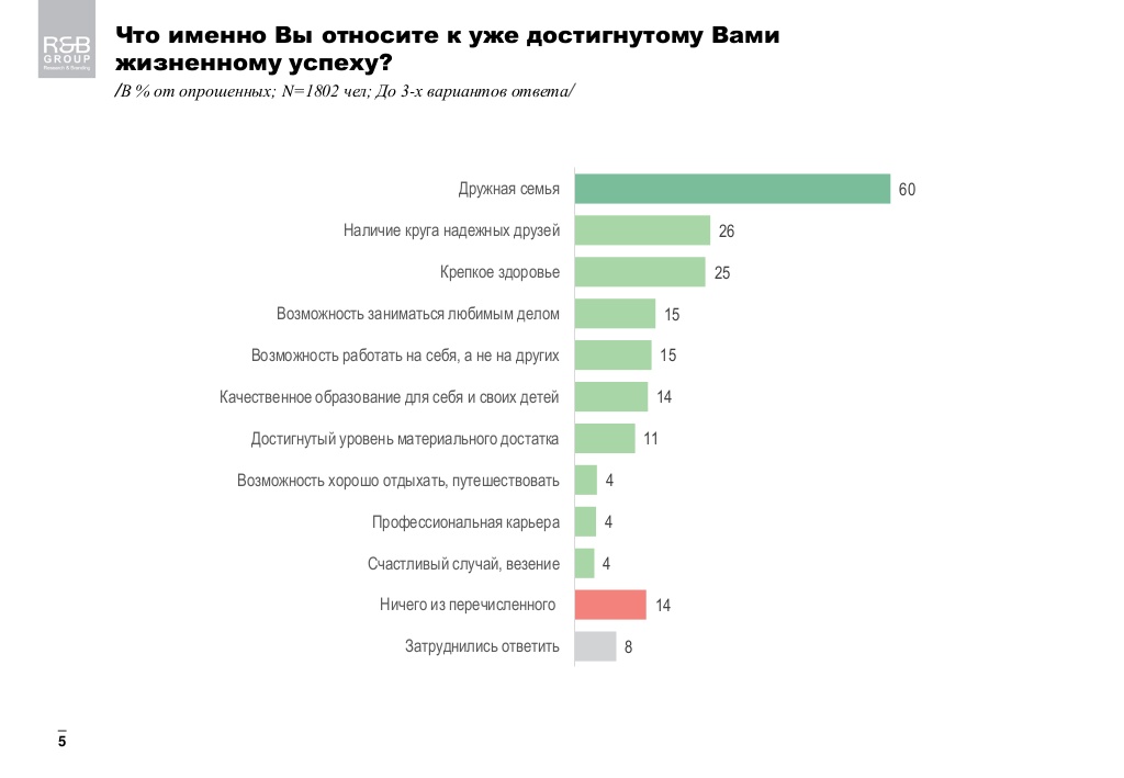 Говорячи про здобутки, з яких складається їх власний життєвий успіх, жителі України найчастіше згадували такий фактор, як дружна сім'я (60%). Помітно рідше в числі мірила успішності згадувалися надійні друзі (26%), міцне здоров'я (25%), можливість працювати на себе (15%), заняття улюбленою справою (15%), гарна освіта (14%) і ряд інших позицій.