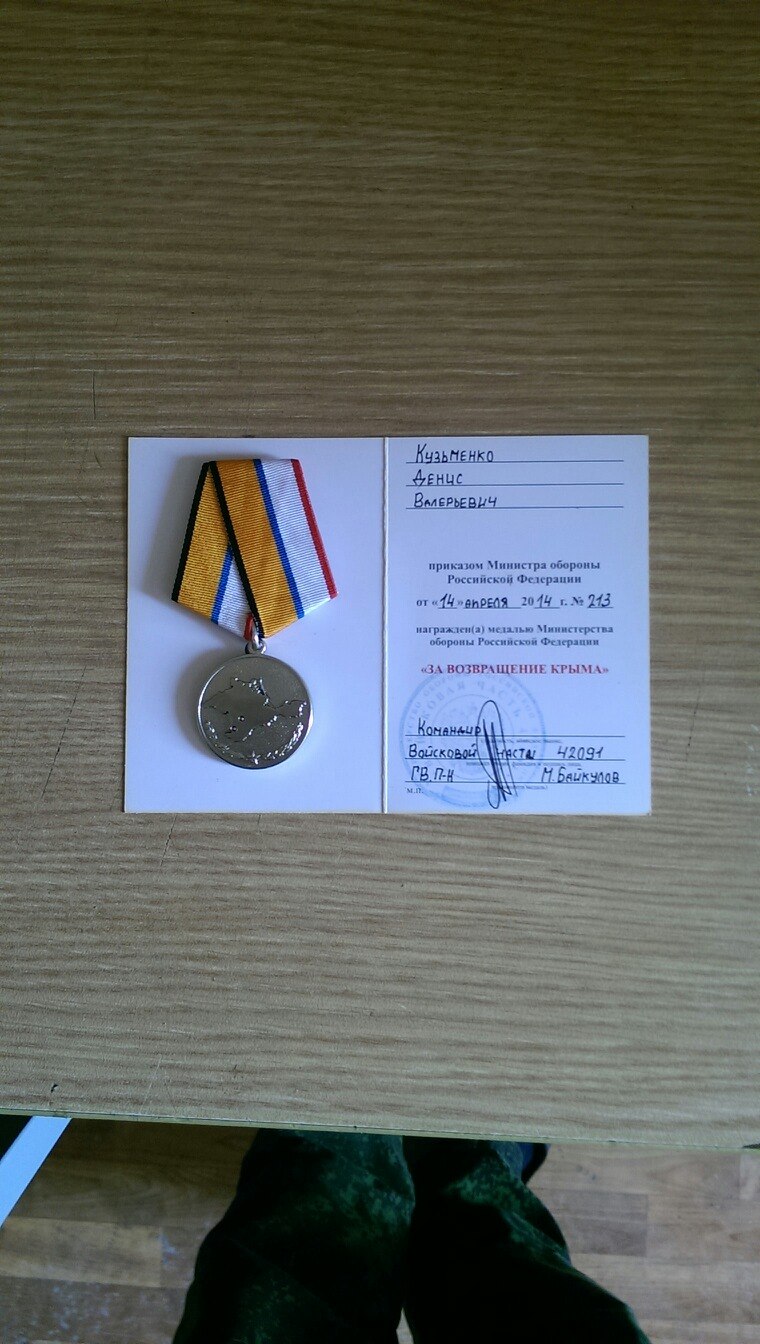 Так, на сторінці Кузьменка у російській соціальній мережі "ВКонтакте" є його фото у військовій формі на фоні дорожніх вказівників у Криму, а також медалі "За возвращєніє Крима" та нагородного посвідчення до неї, у якому вказано дату: 14 квітня 2014 року.