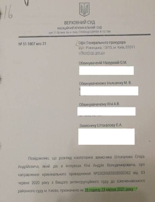 2 квітня обвинувальний акт у цьому провадженні остаточно відправили до Антикорупційного суду.