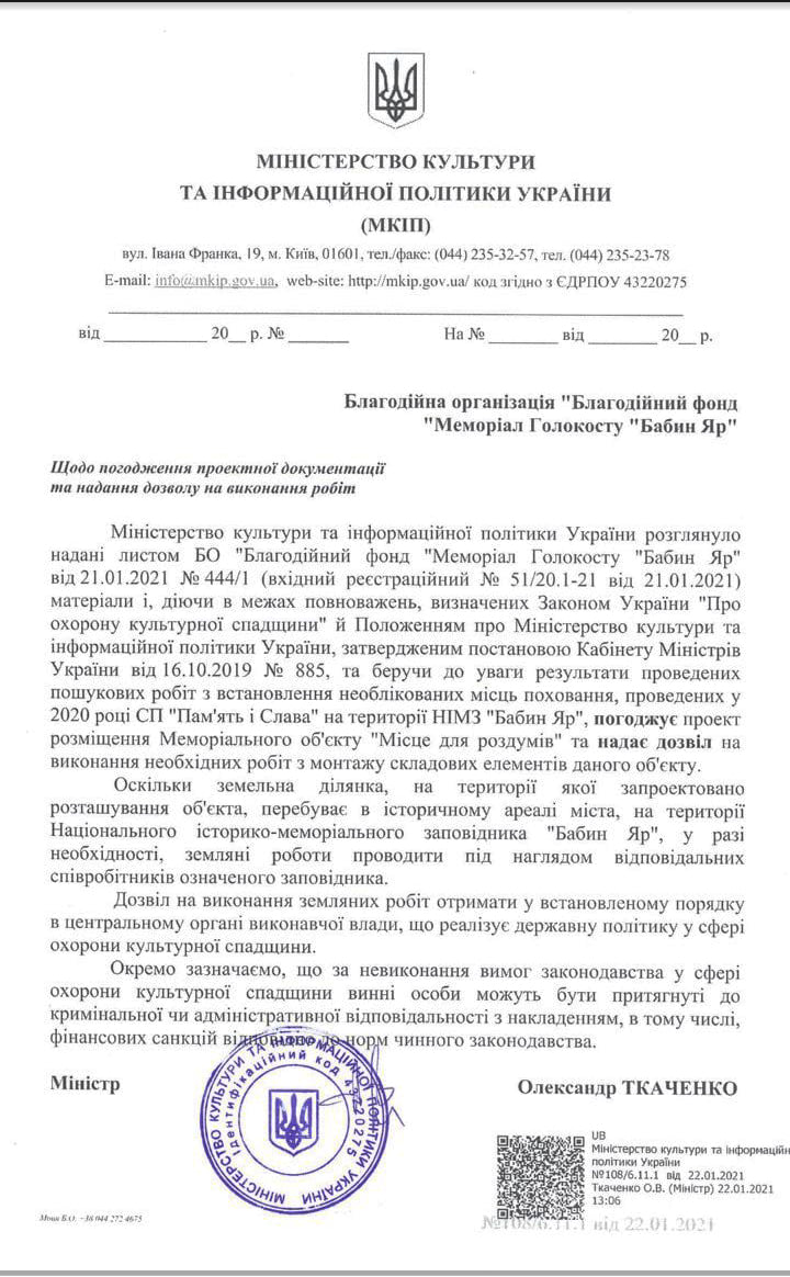 При цьому він додав, що 27 січня за прямим розпорядженням очільника Мінкульту співробітникам Меморіального центру передали всі креслення будівлі адміністрації колишнього єврейського цвинтаря. Раніше там передбачалося створення державного Меморіального музею пам'яті жертв Бабиного Яру.