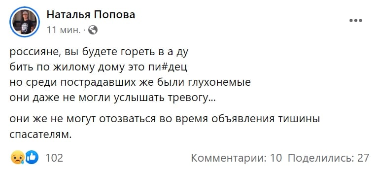 Ракетний удар… По гуртожитку… Будівля вщент зруйнована. Точну кількість загиблих і поранених встановлюємо. Підлий і цинічний удар по цивільних, що не має жодного виправдання й демонструє безсилля агресора. Не пробачимо, помстимося", — написав він.