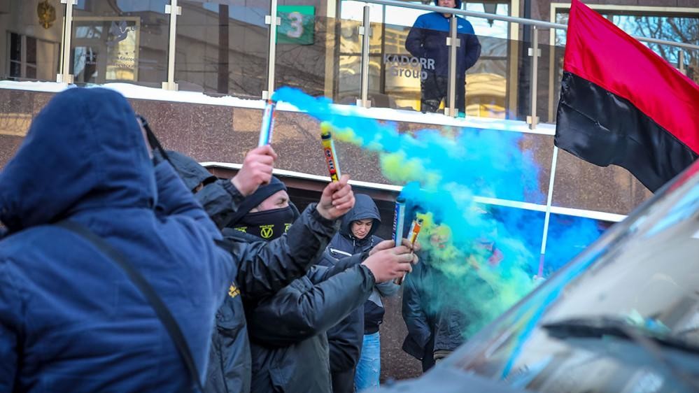 Раніше повідомлялося, що у неділю, 18 лютого, представники правих організацій влаштували у Києві акцію "Смерть Росії", під час якої закидали камінням і яйцями будівлі "Сбербанку Росії" і "Росспівробітництва".