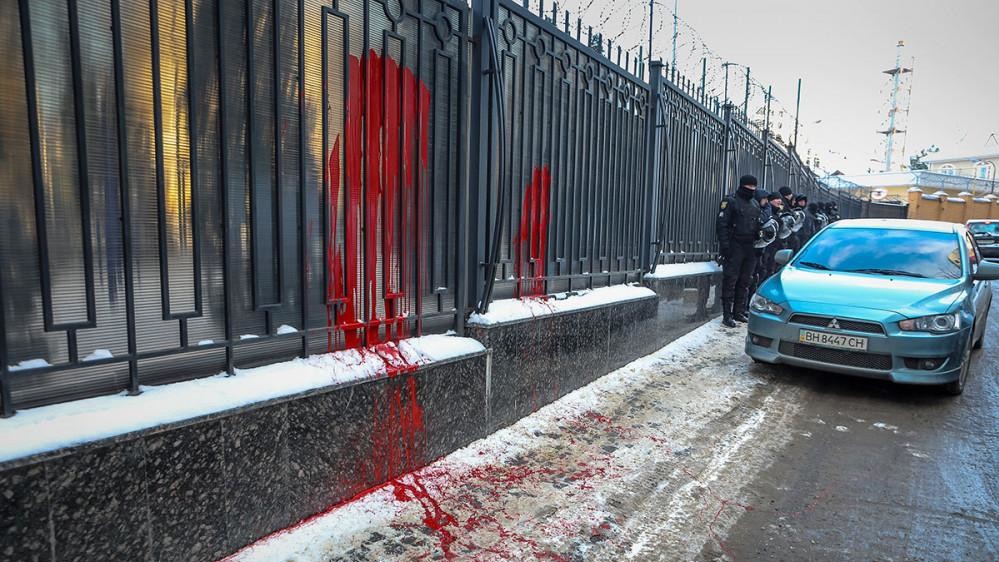 Активісти палили фаєри і співали державний гімн, наприкінці мітингу паркан консульства було облито червоною фарбою. Прогоріли і недогорілі фаєри також полетіли через паркан на територію дипломатичної установи.