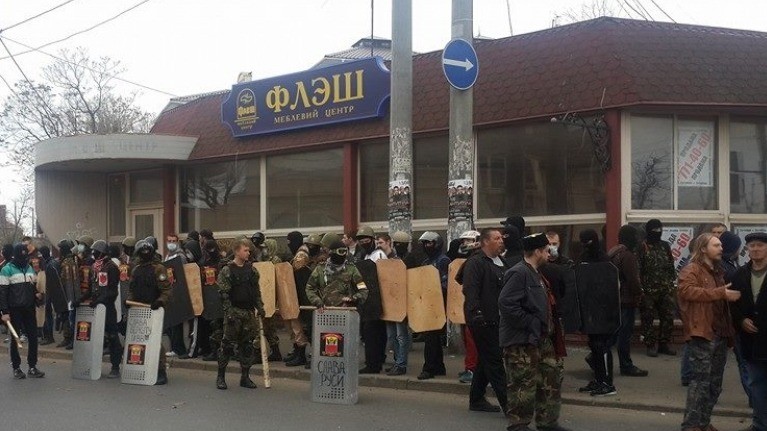 Неподалік від готелю, на іншій стороні Фонтанської дороги, знаходиться група з приблизно трьох десятків проросійських активістів у касках, масках і з кийками.