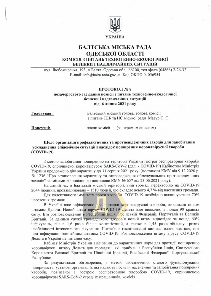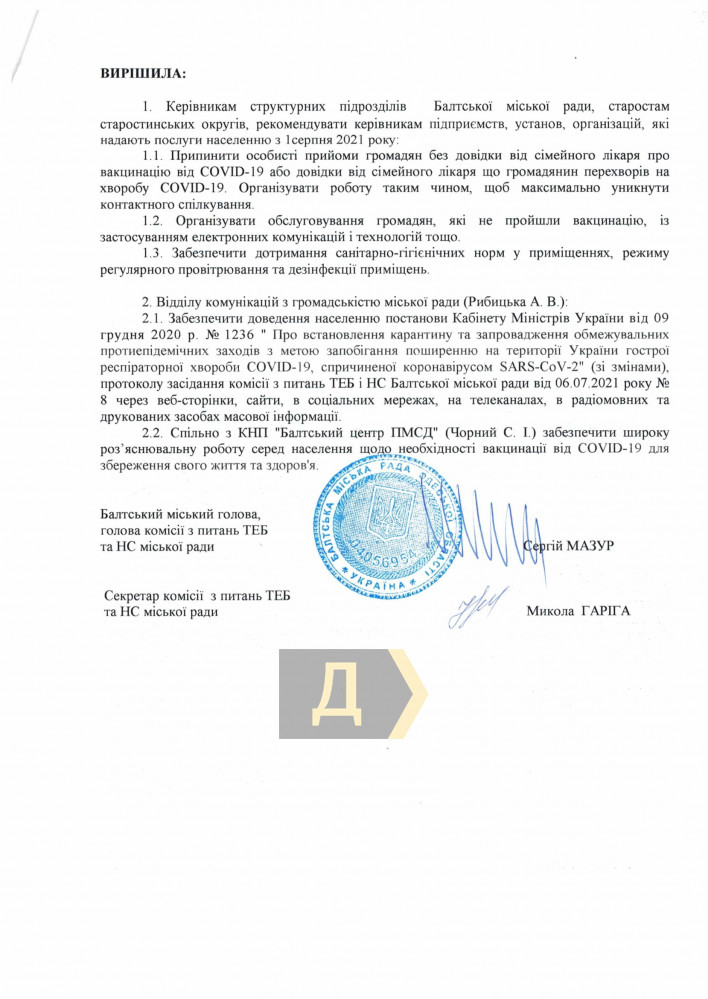 В Одеській області жителів Балтської об'єднаної територіальної громади не приймають в адміністративних будівлях, якщо у них немає щеплення проти коронавірусу або довідки про одужання від COVID-19.