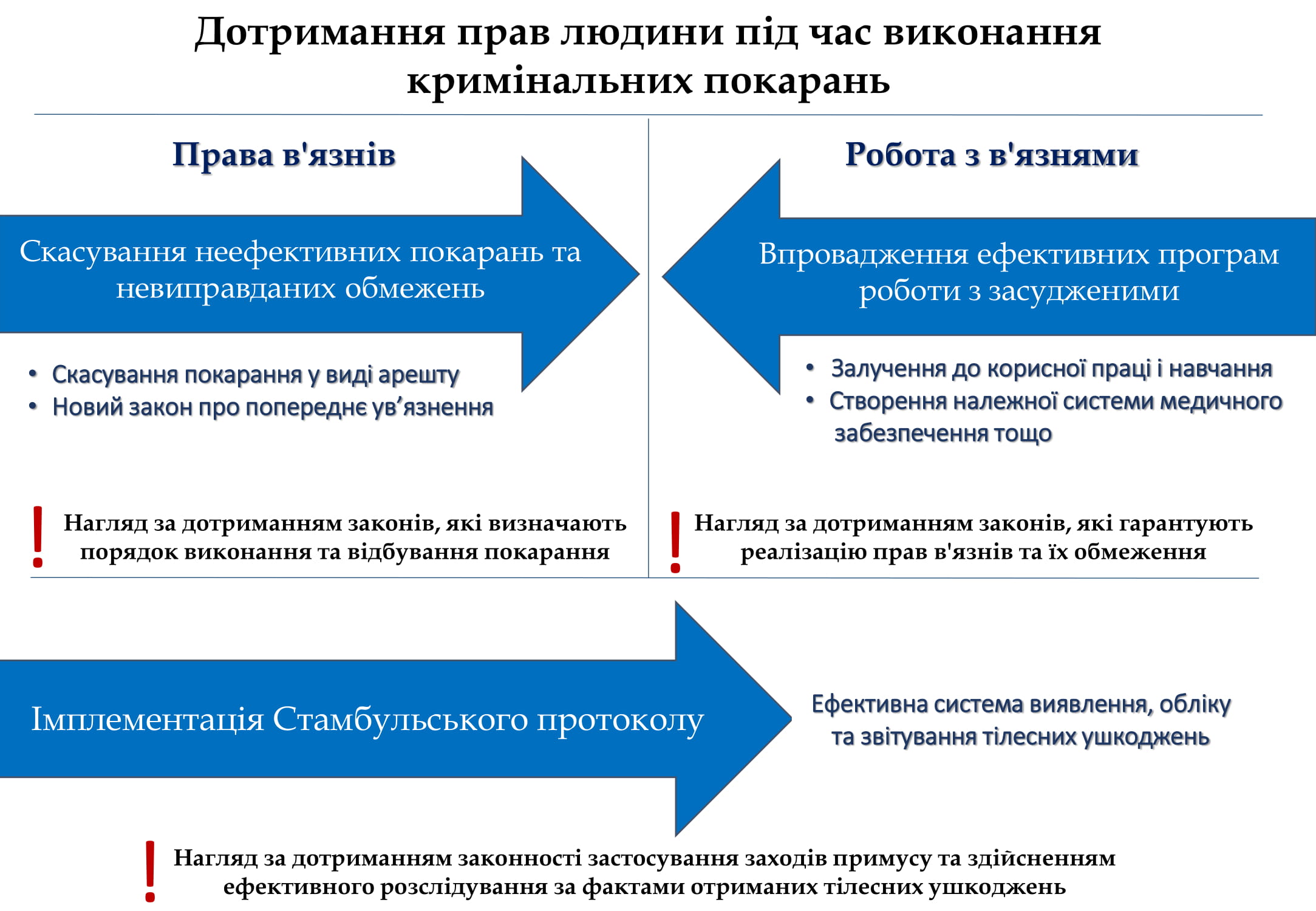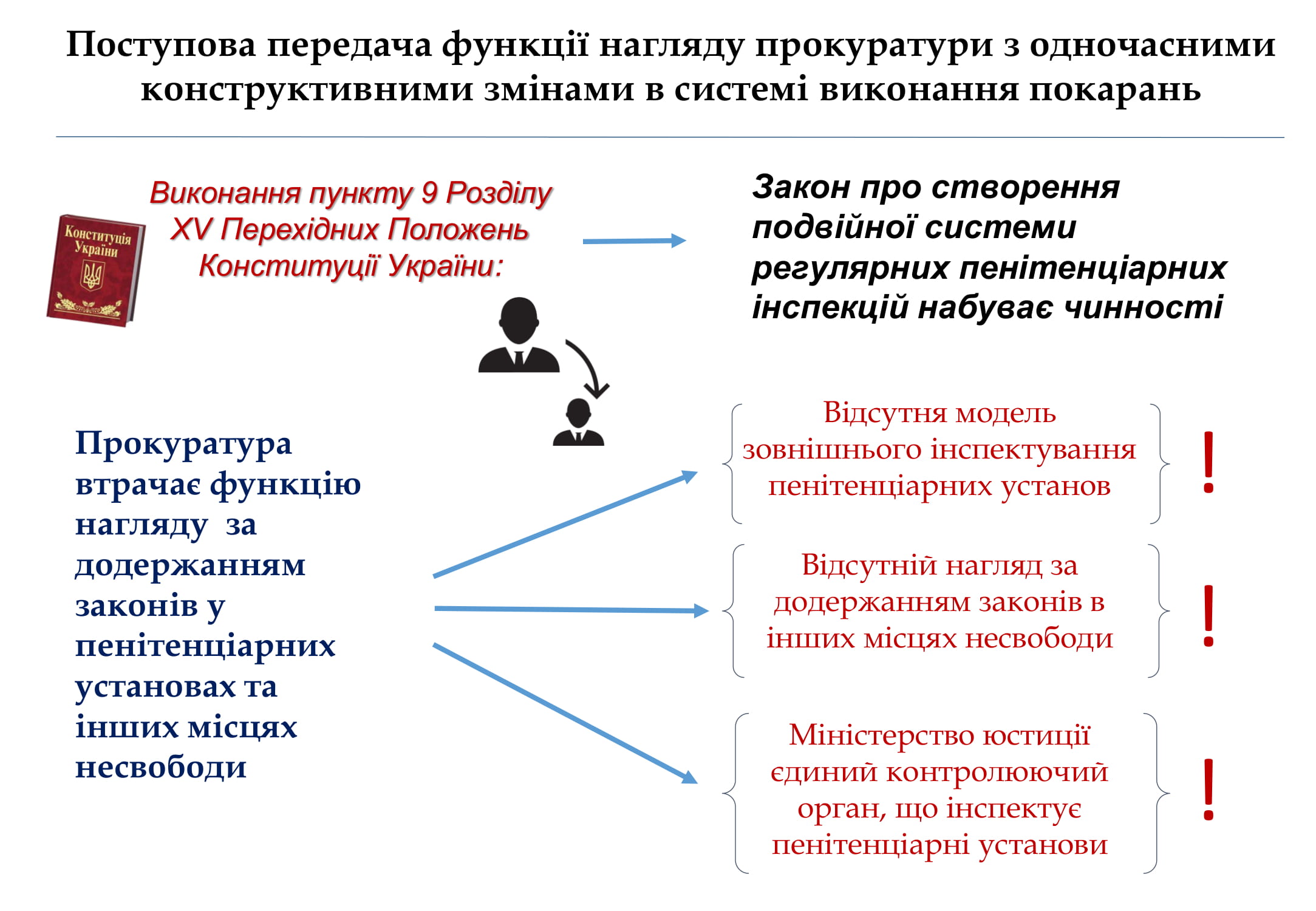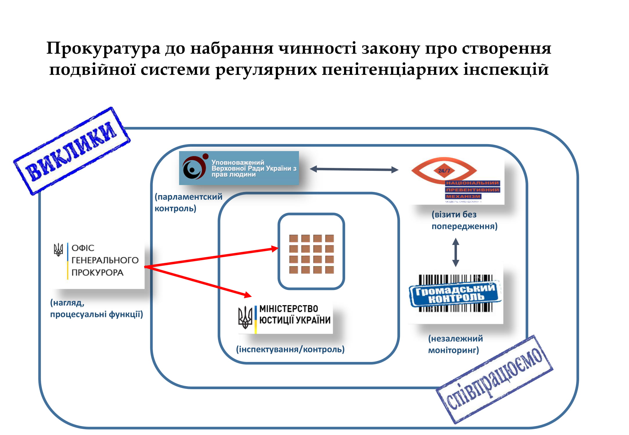 У прокуратурі наголосили на важливості поступової передачі функції нагляду за додержанням законів при виконанні судових рішень у кримінальних справах і застосуванні до громадян заходів, пов’язаних із обмеженням волі. Водночас, наголошують прокурори, на час переходу важливо забезпечити належний механізм захисту прав в’язнів.