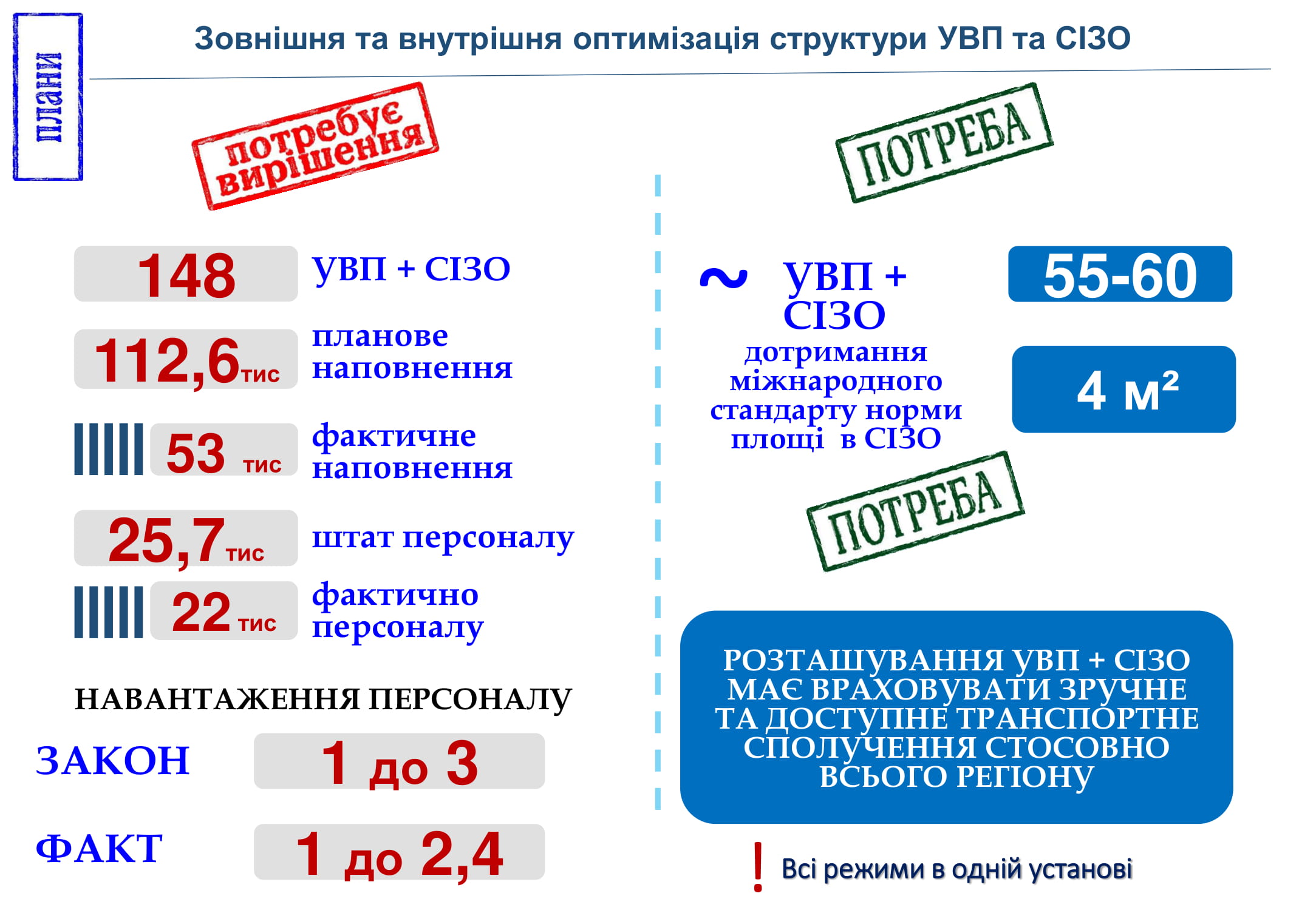 За даними Мін'юсту, слідчі ізолятори в Україні заповнені на 95% і майже всі не відповідають нормам, які є в Європі. Докладніше про реформування пенітенціарної системи в Україні читайте у статті Гюндуза Мамедова «Як зрушити з місця реформу пенітенціарної системи: план є, потрібно діяти» для ZN.UA.