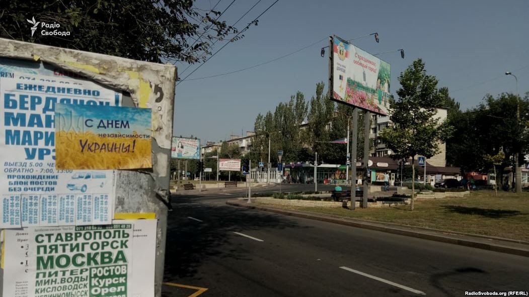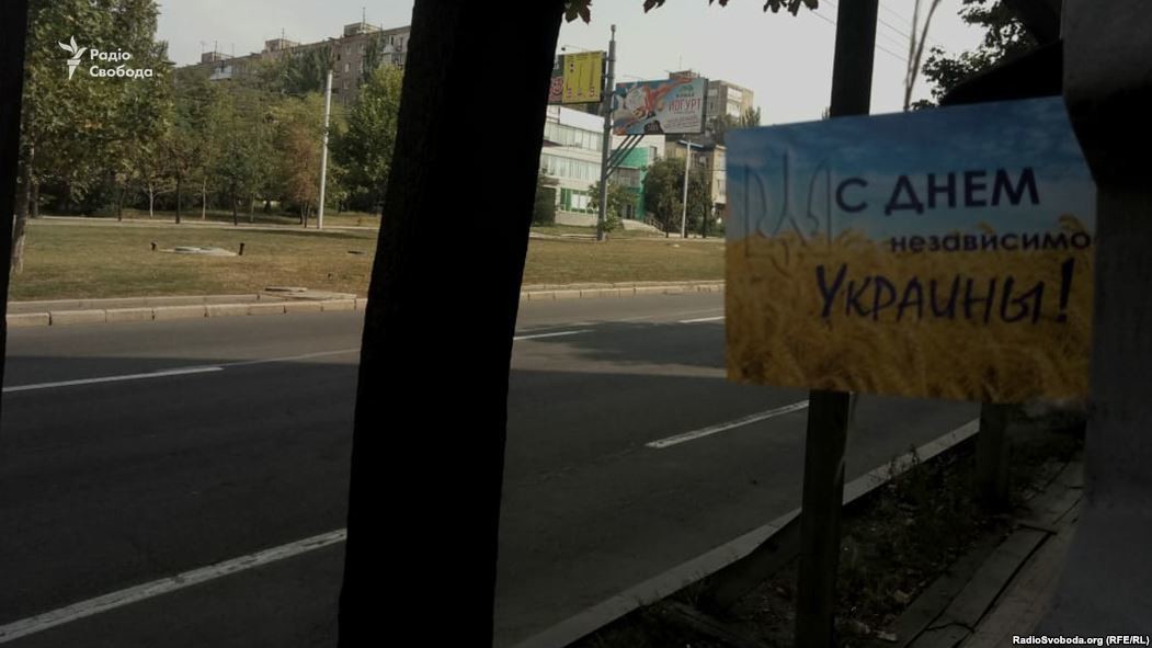В окупованому Донецьку до Дня Незалежності України розклеїли синьо-жовті листівки з привітаннями. Про це повідомили журналістам "Радіо Свобода" місцеві жителі. Вони надіслали фотографії з відповідними постерами у різних районах непідконтрольного уряду міста. Листівки з'явилися біля будівлі Калінінсього райвиконкому, на бульварі Шевченка, біля торгового центру "Амстор" та в інших місцях.