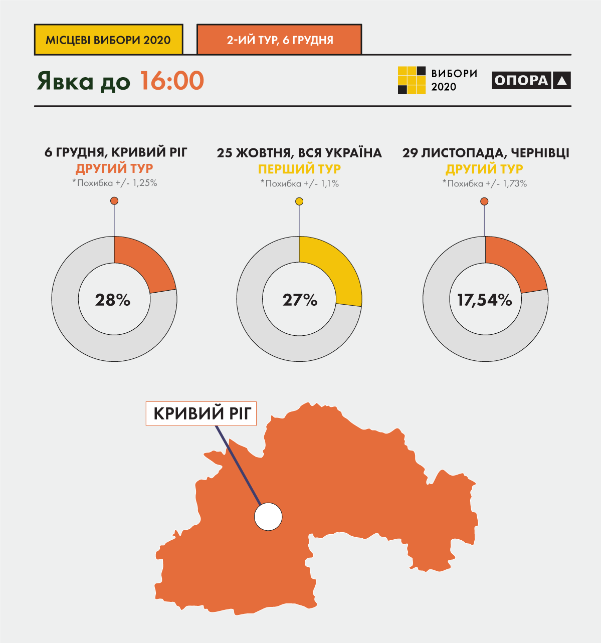 Явка виборців під час повторного голосування на виборах міського голови в місті Кривий Ріг Дніпропетровської області, станом на 16:00 склала 28% (похибка - 1,25%), повідомляється на сайті Громадянської мережі "Опора".