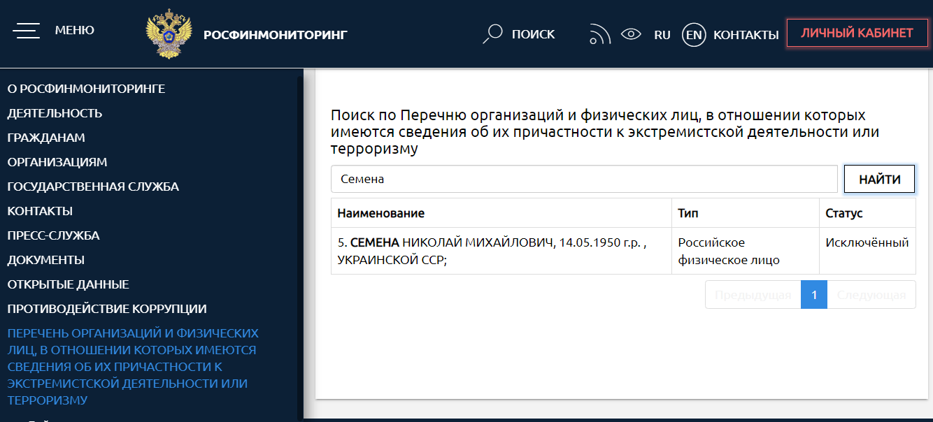 У профілі Семени в російському реєстрі статус оновили на "виключений". При цьому в Росфінмоніторинзі журналіст значиться як "російська фізична особа".