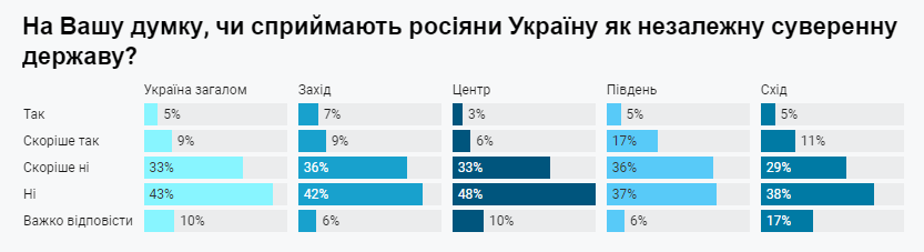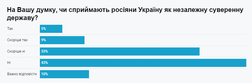 Три чверті громадян України, тобто 76%, вважають, що росіяни не сприймають Україну як незалежну суверенну державу. Такі дані соціологічного опитування оприлюднив Фонд «Демократичні ініціативи» імені Ілька Кучеріва спільно з соціологічною службою Центру Разумкова.