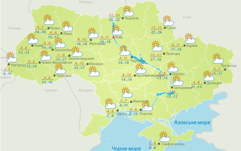 Температура вночі опуститься до 16-21° морозу, на північному сході до -26°С, вдень буде 8-13° нижче нуля. У південних регіонах і на Закарпатті вночі температура становитиме 9-14°, вдень 3-8° морозу (на Закарпатті близько 0°).