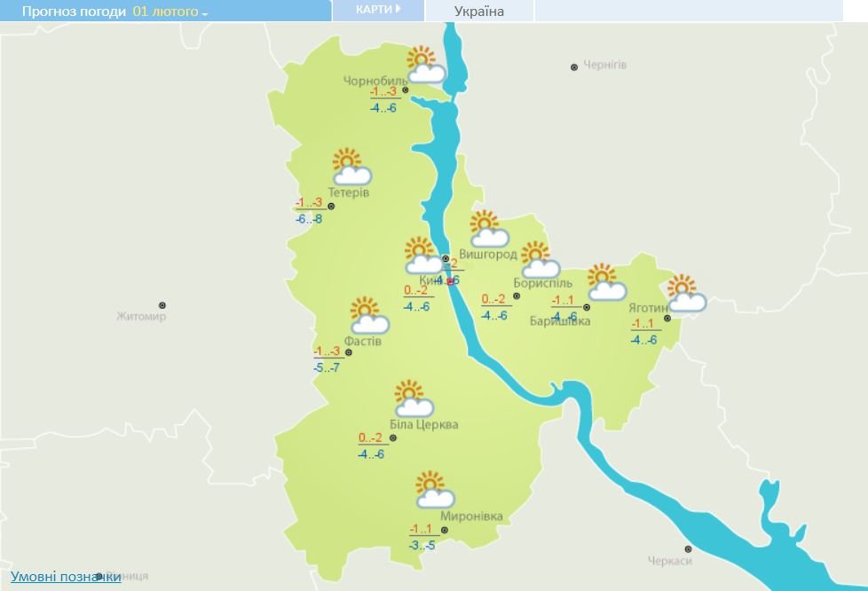 1 лютого сніг пройде лише у західних регіонах та у Карпатах, але дощитиме в Одеській та Сумській областях. На решті території країни опадів синоптики не прогнозують.