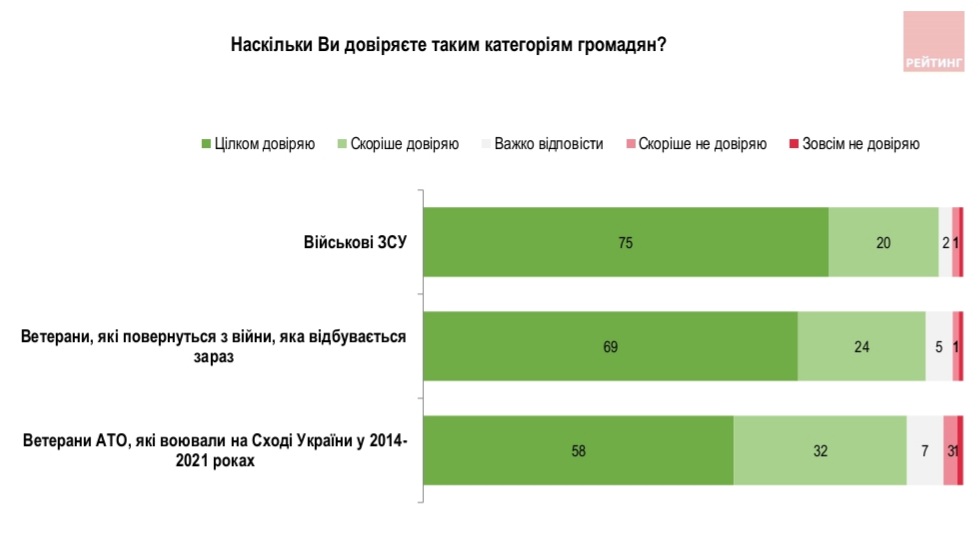В Україні 95% опитаних громадян найбільше довіряють військовим ЗСУ, 93% - ветеранам нинішньої війни та 95% – ветеранам АТО (ООС) 2014-2021 року, свідчать дані опитування групи “Рейтинг”, проведеного з ініціативи Українського ветеранського фонду Мінветеранів.