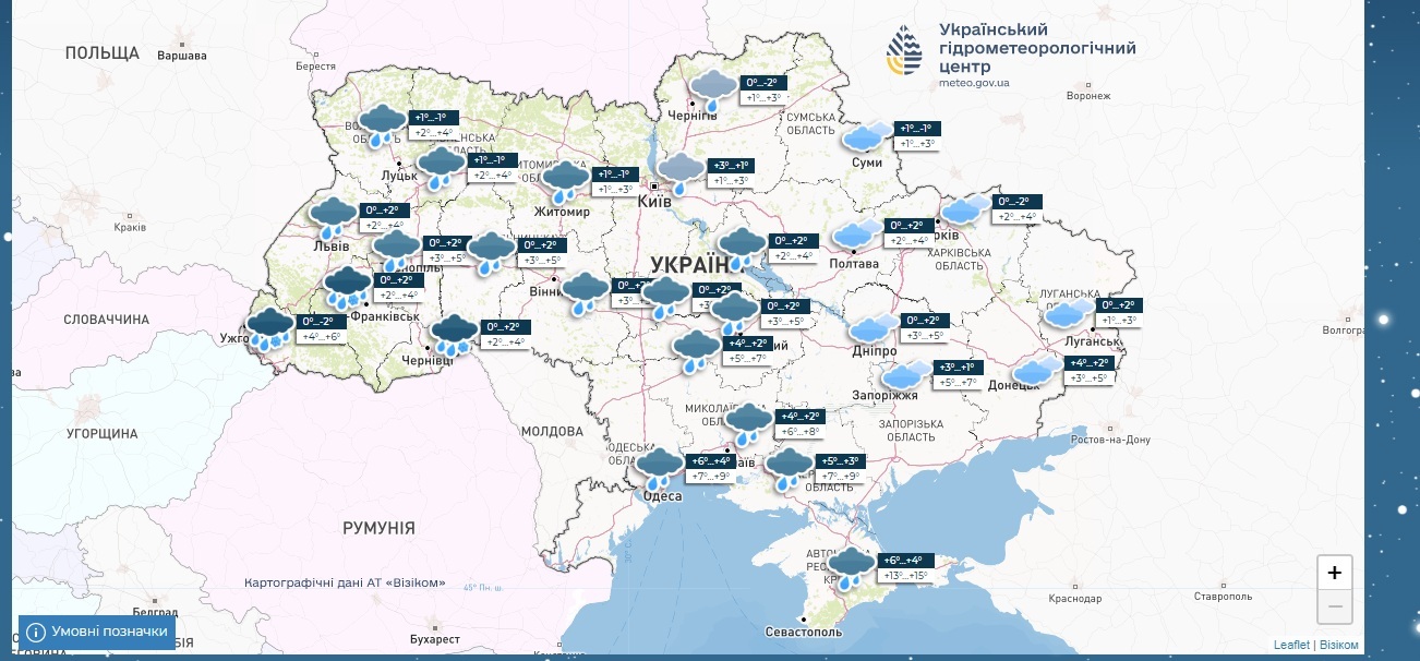 У Києві впродовж 9 грудня +1...+3°C, можливі дощі.