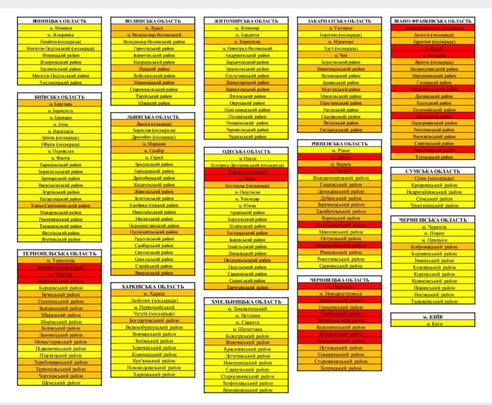 Київ, Вінниця, Житомир, Одеса, Рівне, Хмельницький і Чернігів, а також більшість населених пунктів у більшості областей опинилися у «жовтій» зоні.