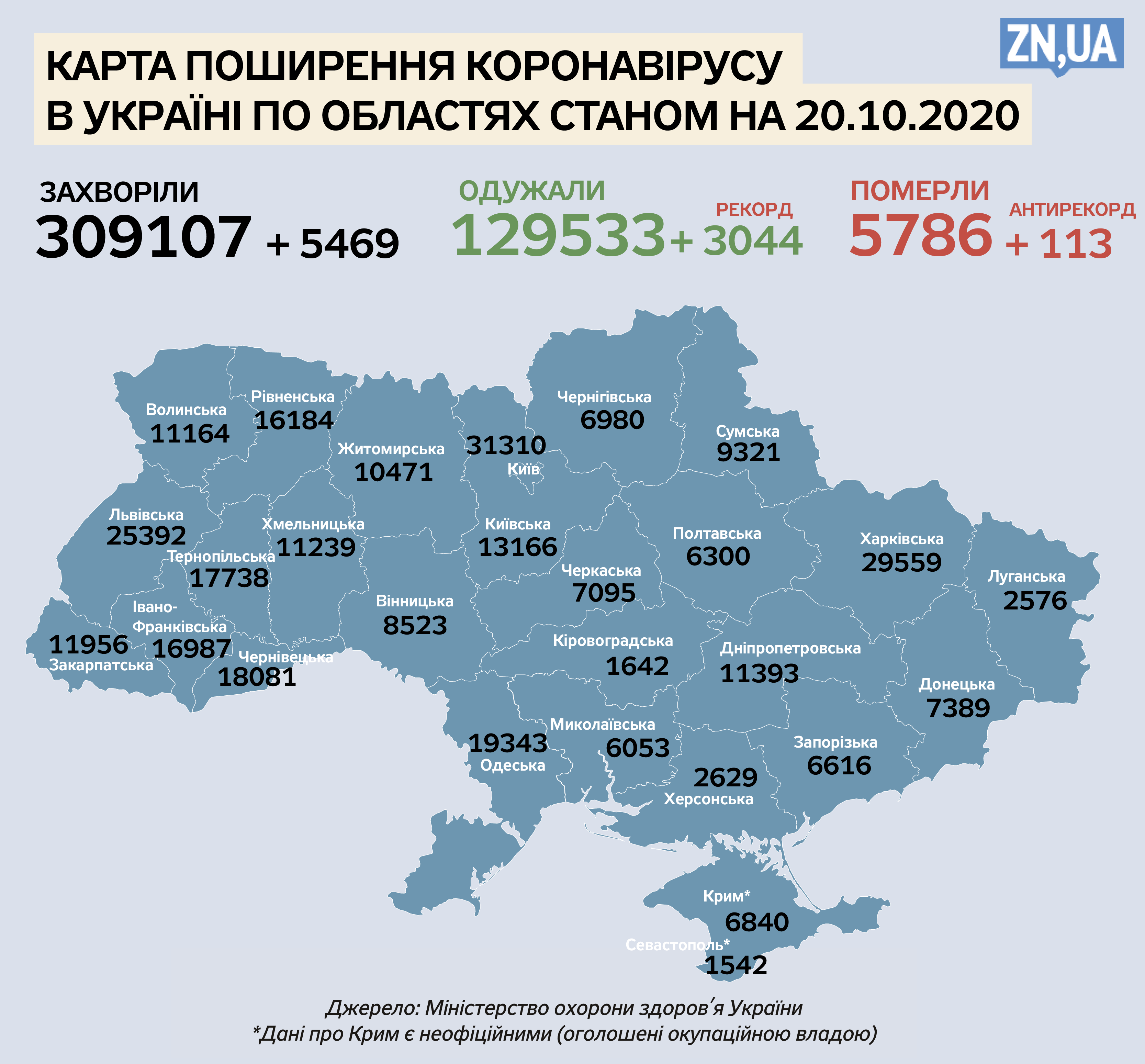 Протягом понеділка, 19 жовтня, в Україні виявили 5 469 нових випадків зараження коронавірусом. Всього з початку пандемії в країні на коронавірус захворіли 309 107 осіб. Про це повідомляє Рада нацбезпеки і оборони.