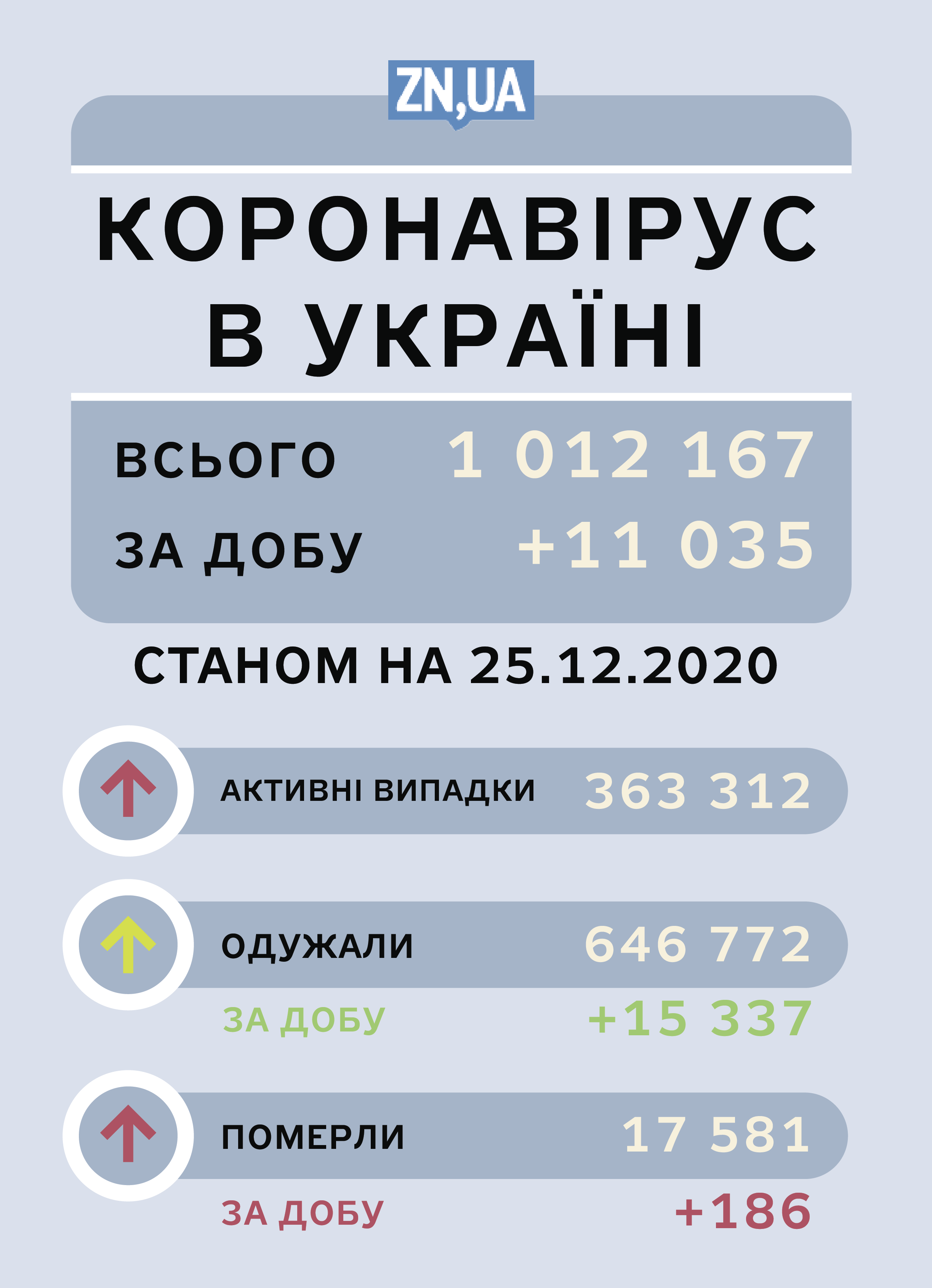 Упродовж четверга, 24 грудня, в Україні діагностували 11 035 нових випадків коронавірусної хвороби COVID-19. Зокрема, захворіли 484 дитини та 388 медпрацівників. Про це йдеться в щоденному ранковому зведенні Міністерства охорони здоров'я України.