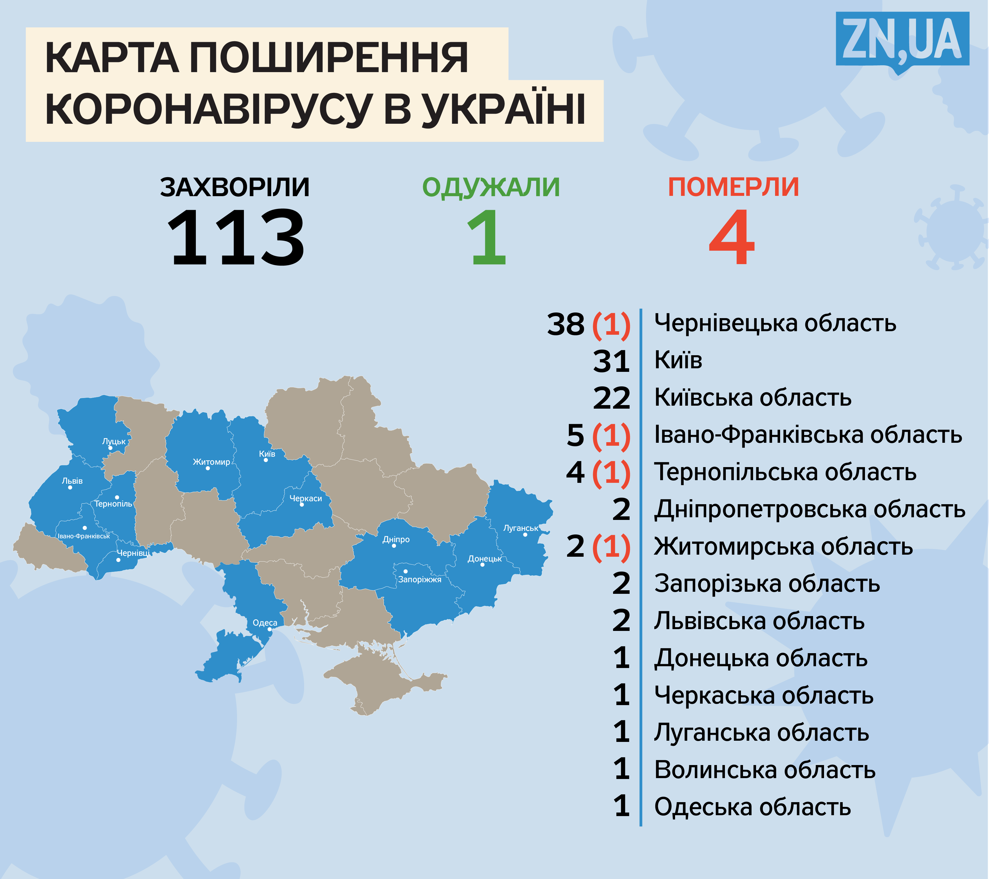 Станом на ранок середи, 25 березня, в Україні зафіксовано 113 випадків інфікування Covid-19. Про це повідомило Міністерство охорони здоров'я.