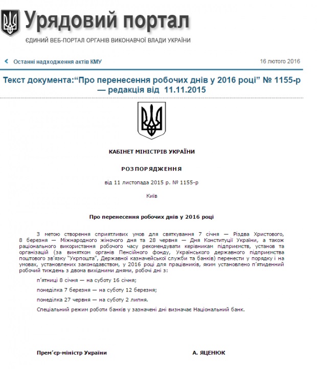 Всього в 2016 році Кабмін дозволив перенести три робочих дні з подальшим відпрацюванням: з п'ятниці 8 січня - на суботу 16 січня; з понеділка 7 березня - на суботу 12 березня; понеділка 27 червня - на суботу 2 липня.