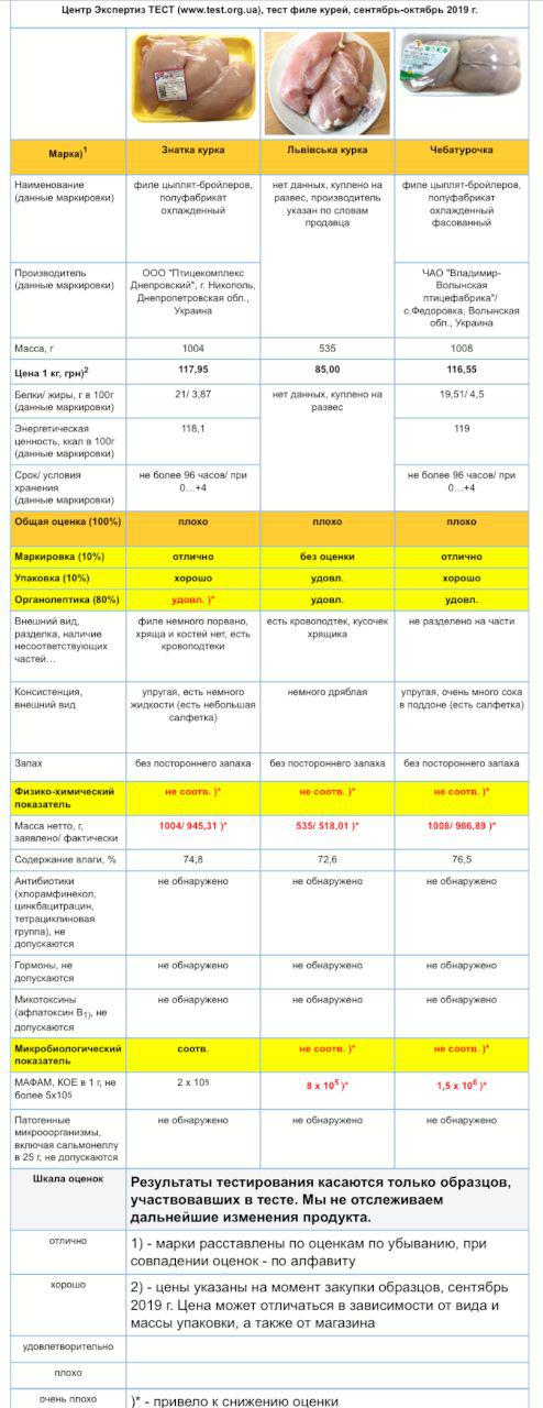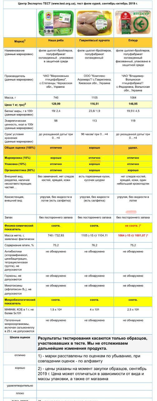 За результатами порівняльного тестування загальна оцінка "відмінно" у марки "Наша ряба", загальна оцінка "добре" у філе "Гаврилівські курчата". Продукція марки "Епікур" отримала "задовільно".