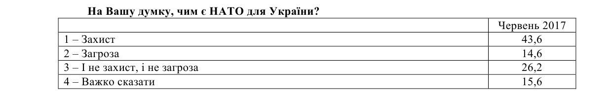 Існують істотні регіональні відмінності у розумінні того, чим є НАТО для України: у Західному регіоні НАТО однозначно сприймається як захист (81%), істотно переважає сприйняття НАТО як захисту і в Центральному регіоні (68%). А от у Південному та Східному регіонах одностайності немає: у Південному регіоні 19% жителів сприймає НАТО як захист, стільки – 18% – як загрозу, для 25% НАТО не є ані захистом, ані загрозою, а 37% взагалі не змогли висловити певну позицію. У Східному регіоні 30% сприймають НАТО як захист, 28% – як загрозу і 30% не бачать в НАТО ані захисту, ані загрози.