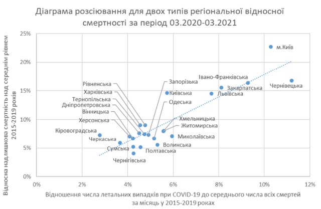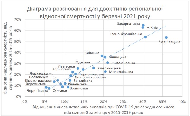 Найбільш постраждалі регіони лишилися незмінними, порівняно з лютим 2021 року, серед них: м. Київ (зростання загальної смертності над середнім рівнем березня 2015–2019 років на 62,8%), Закарпатська область (65,0%), Івано-Франківська область (54,2%) та Чернівецька область (53,8%).