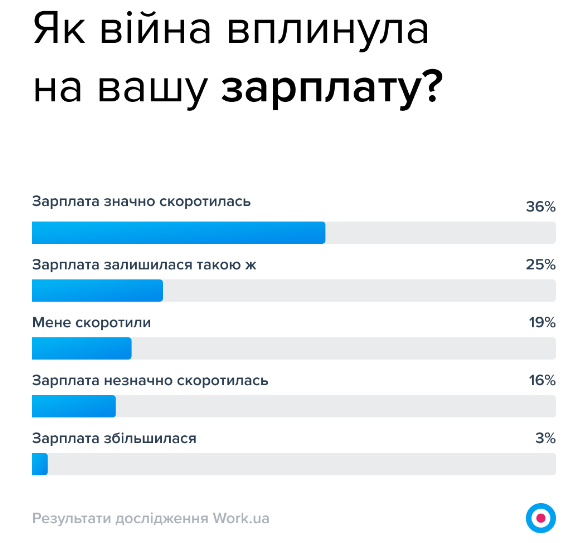 Війна вдарила по гаманцях 75% опитаних українців: 36% з них відчули значне скорочення зарплат, 16% – незначне. І лише у 3% спостерігається позитивна динаміка.