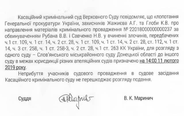 Повідомляється, що засідання призначене на 14:00 11 лютого. Зазначається, що засідання було призначене на 4 лютого, проте не відбулося через самовідвід одного з членів колегії суддів. Прокуратура порушує клопотання про передачу справи з Слов'янського міськрайонного суду Донецької області в Чернігівський районний суд Чернігівської області.