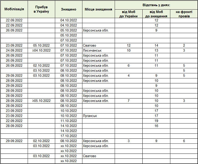 «Нам частково вдалось встановити дані про дату мобілізації та прибуття до України. З цих даних можна зробити наступні висновки – через тиждень після мобілізації росіянин потрапляє до України. Через 12 днів після мобілізації він гине в Україні. На фронті в Україні він встигає проводити, приблизно, 4 дні,  армії. В середньому – 4 доби життя, а далі – смерть, поранення або полон, йдеться у статті InformNapalm. – ЗСУ не пробачає бажання росіян повоювати з Україною. “Сумна” статистика перших знищених "мобіків" приблизно показує, як воюватиме російський мобілізований проти вмотивованої української армії».