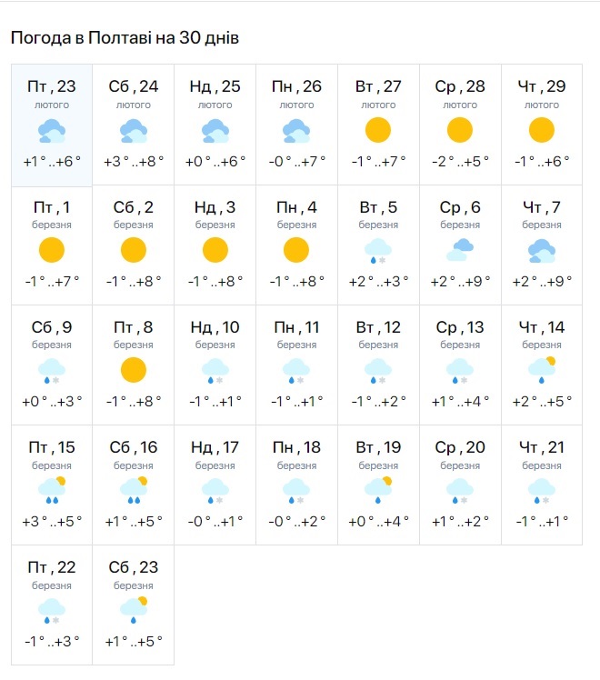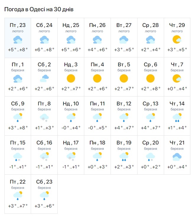 8 березня очікують +1 вночі та +9 вдень. Буде сонячно та без опадів. Після 9 березня температура знизиться. З 10 по 17 березня прогнозують сніг. Вдень в цей період буде близько 0, вночі до -4.
