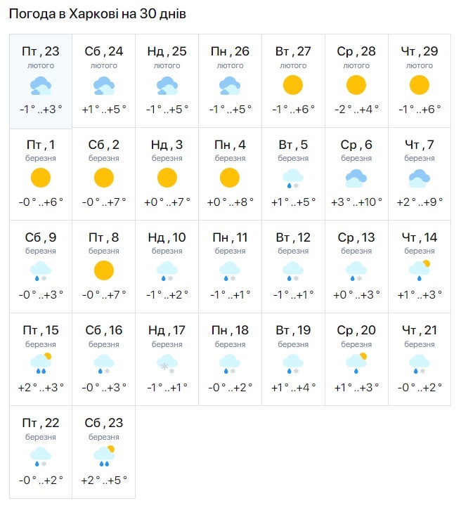 З 1 по 8 березня у Харкові буде тепло і сонячно. Вночі буде 0, а вдень – від +5 до +10. З 10 по 12 березня прогнозують коротке похолодання з дощами і зниженням температури вночі до -1.