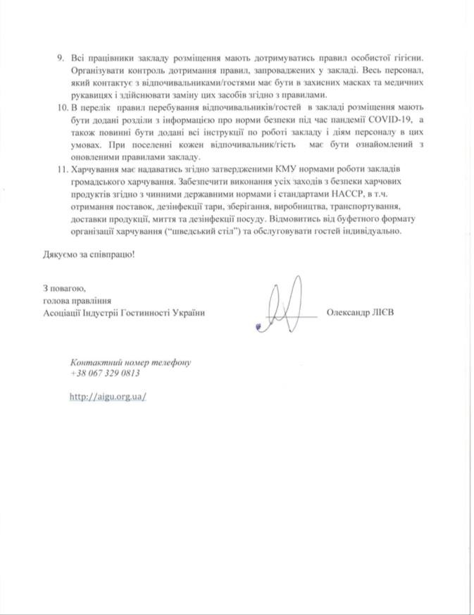 З урахуванням вже наявного практичного досвіду, Асоціація індустрії гостинності та Українська асоціація медичного туризму розробили та представили уряду свій варіант того, як в умовах карантинних обмежень повинні працювати готелі, пансіонати, туристичні бази та клінічні санаторії. Про це на своїй сторінці в Facebook повідомив глава АІГУ Олександр Лієв.