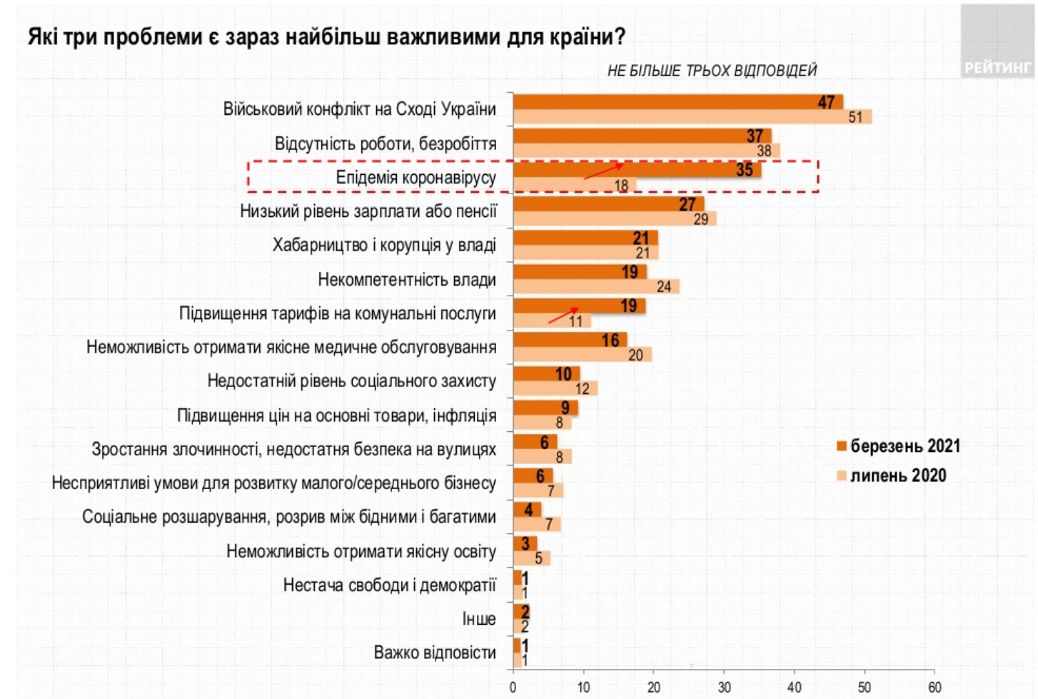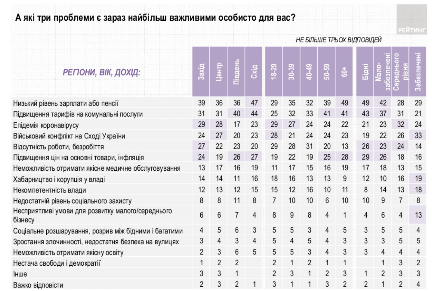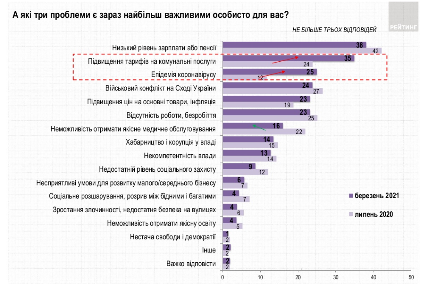 Соціологи зазначають, що з липня 2020 року значно зросла кількість тих, хто вважають особистими проблемами, підвищення тарифів та епідемію коронавірусу.
