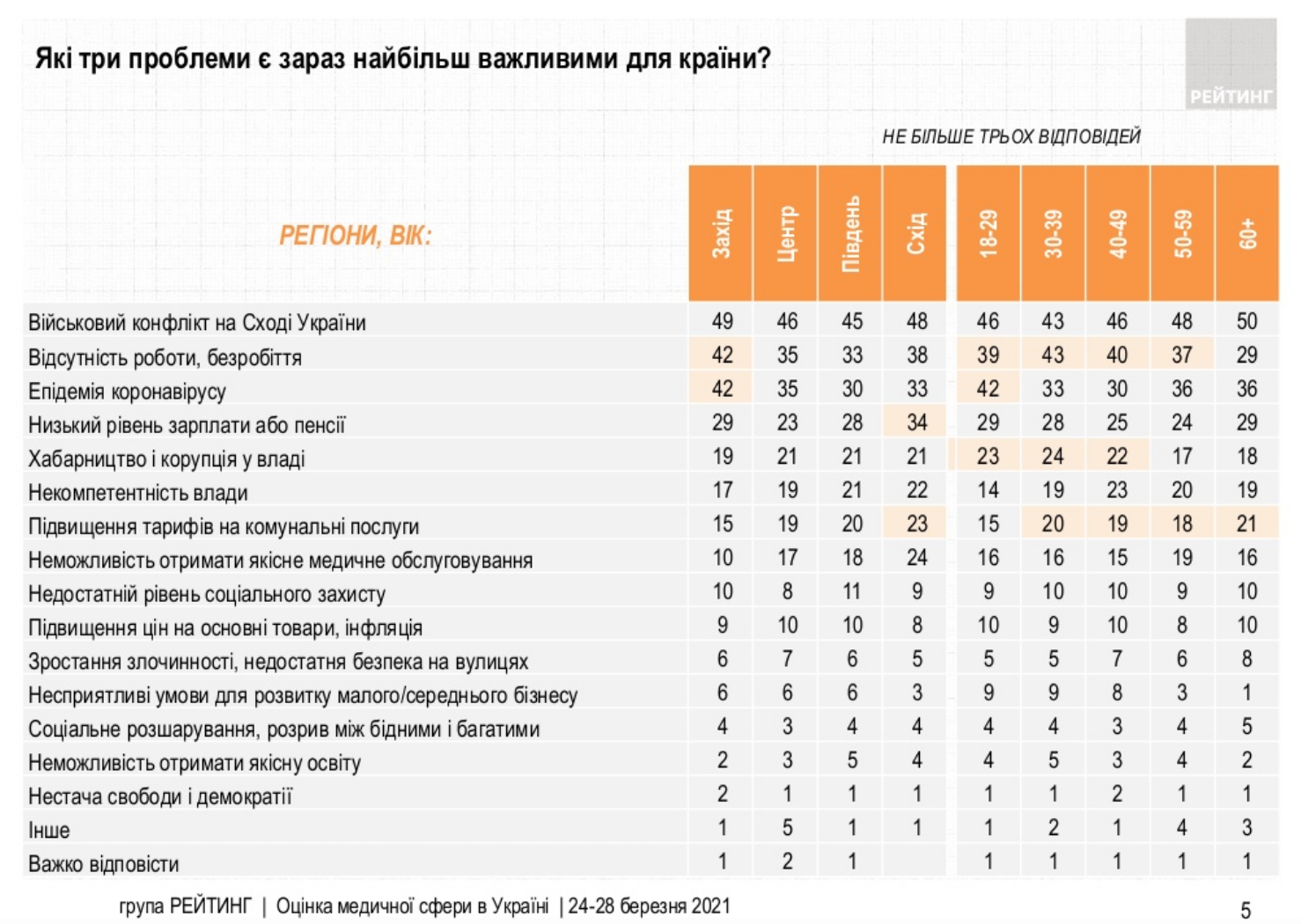 Зазначається, що 47% опитаних до ключових проблем України відносять військовий конфлікт на Сході України, 37% - відсутність роботи, безробіття, 35% - епідемію коронавірусу.