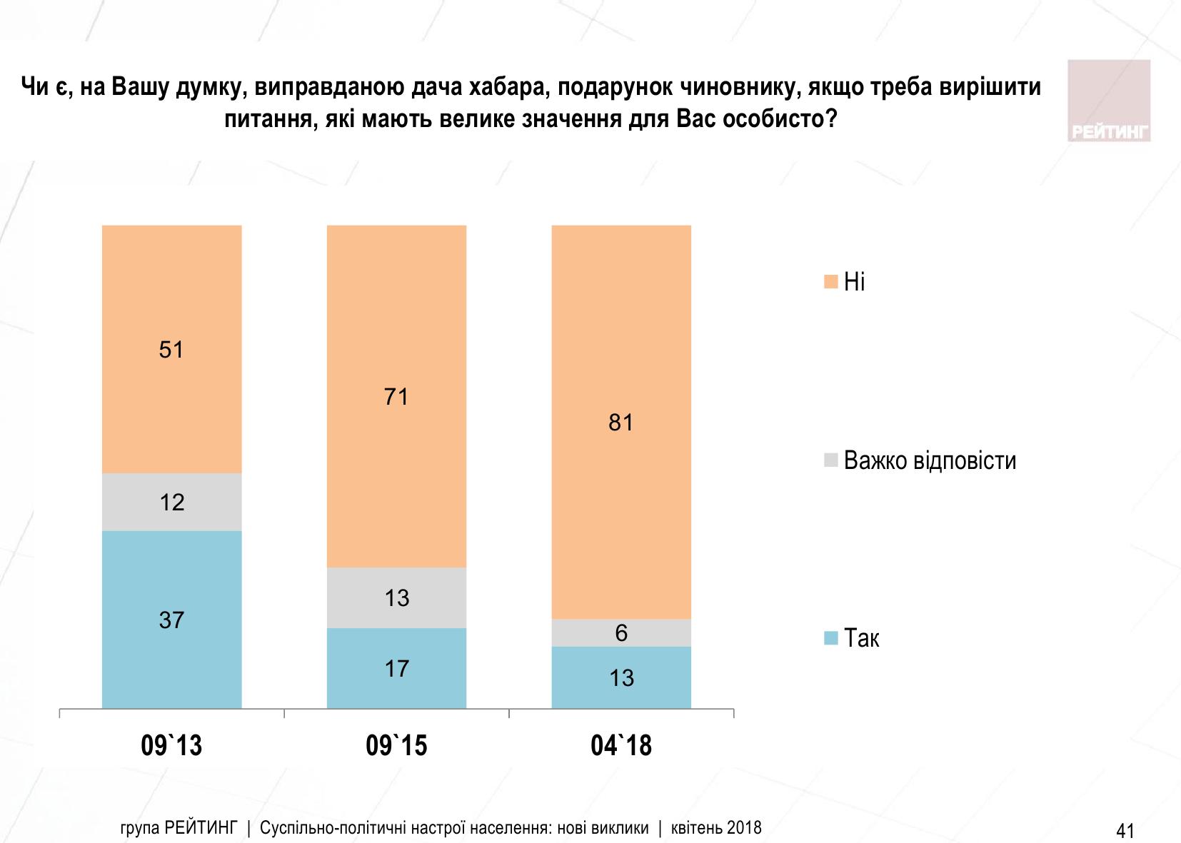За п'ять останніх років частка тих, хто вважає, що хабар є виправданою, якщо необхідно вирішити питання, які мають особисту значимість, зменшилася з 37% до 13%. Також дещо зменшилася і кількість тих, хто давав хабара (з 27% у 2013 році до 22% у 2018 році), свідчать дані Соціологічної групи "Рейтинг".