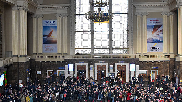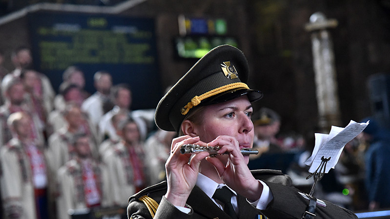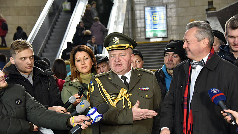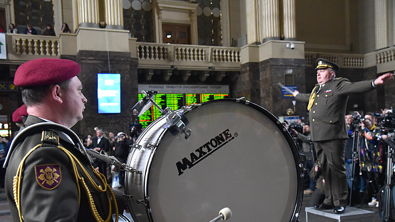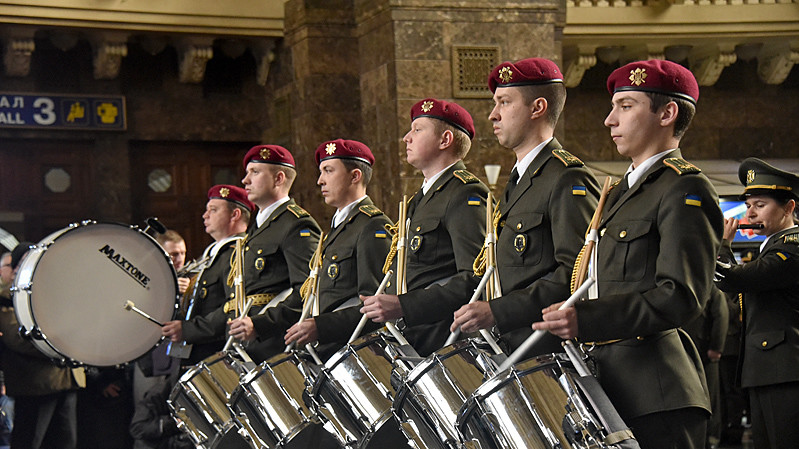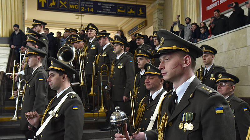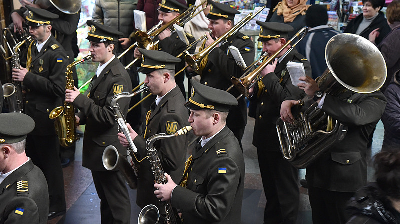 На Центральному залізничному вокзалі Києва в четвер, 14 березня, відбувся виступ зведеного оркестру гарнізону міста Києва, приурочений до Дня добровольця.