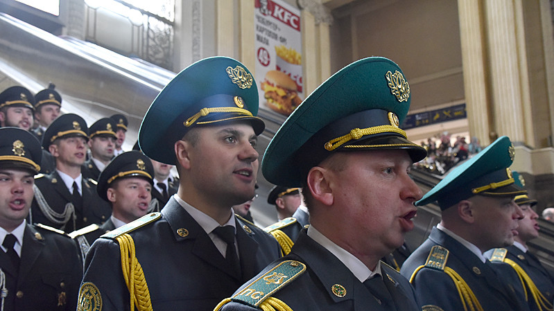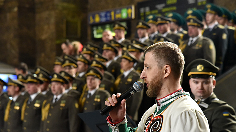 Разом з військовослужбовцями Київського гарнізону на вокзалі грала капела бандуристів.