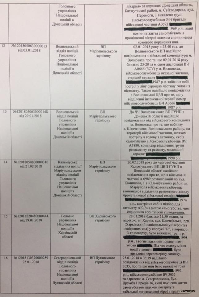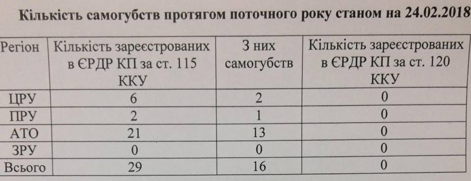 Нагадаємо, раніше головний військовий прокурор Анатолій Матіос повідомляв про те, що в середньому щотижня 2-3 військовослужбовця вчиняють самогубства. З них близько 80% мали ознаки посттравматичного синдрому.