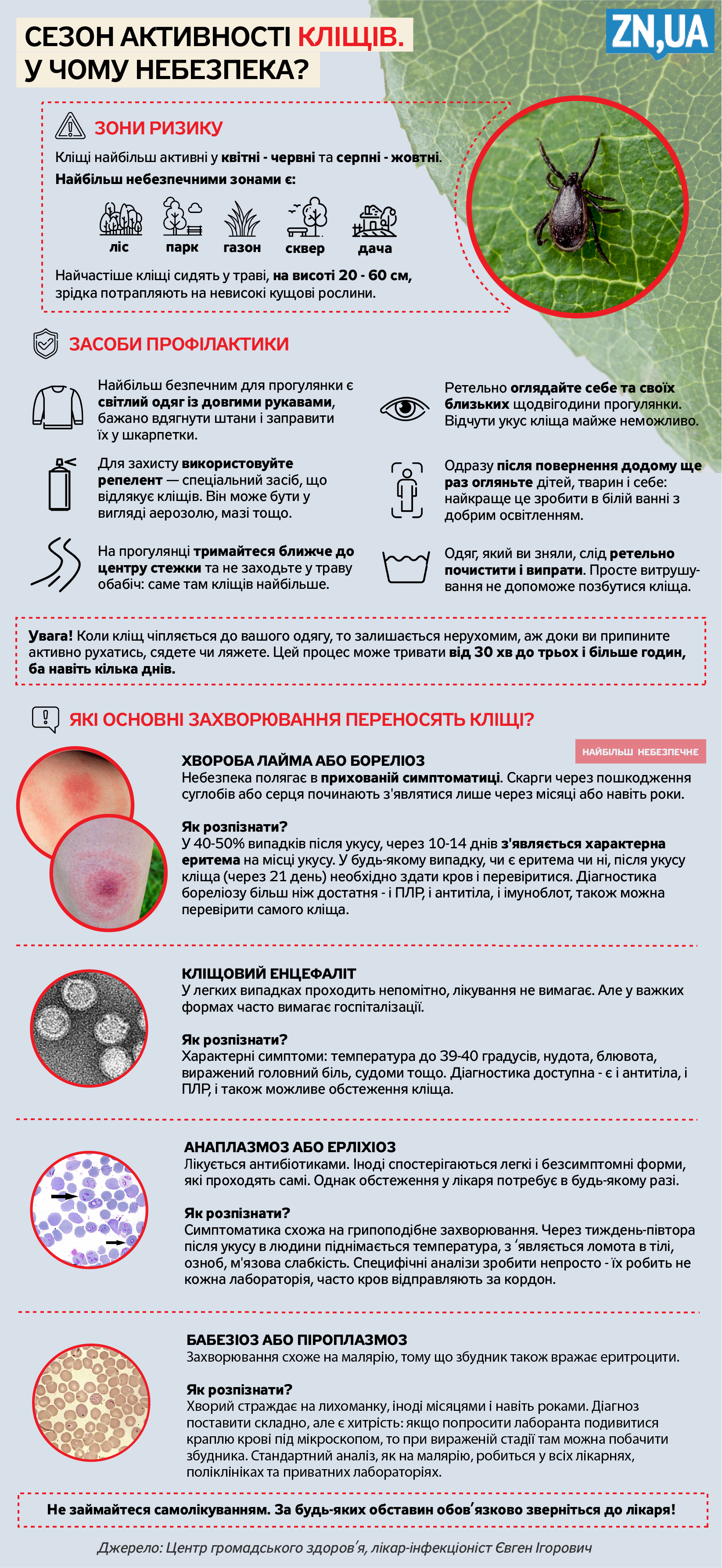 Він зазначив, що основними захворюваннями, які переносять кліщі є: бореліоз. кліщовий енцефаліт, рикетсіози - анаплазмоз і ерліхіоз, бабезиоз.