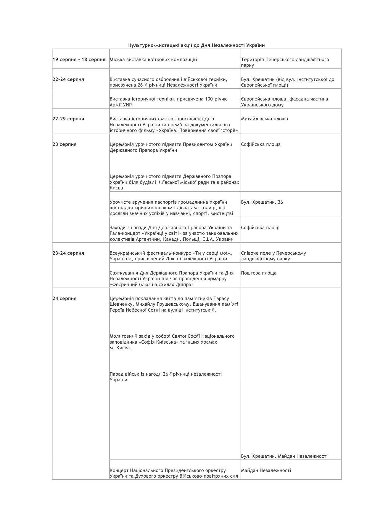 Так, із 22 серпня на вул. Хрещатик (від вул. Інститутської до Європейської площі) буде відкрита виставка сучасного озброєння та військової техніки, присвячена 26-й річниці Незалежності України, та виставка історичної техніки, присвячена 100-річчю Армії УНР (Європейська площа, фасадна частина "Українського дому").