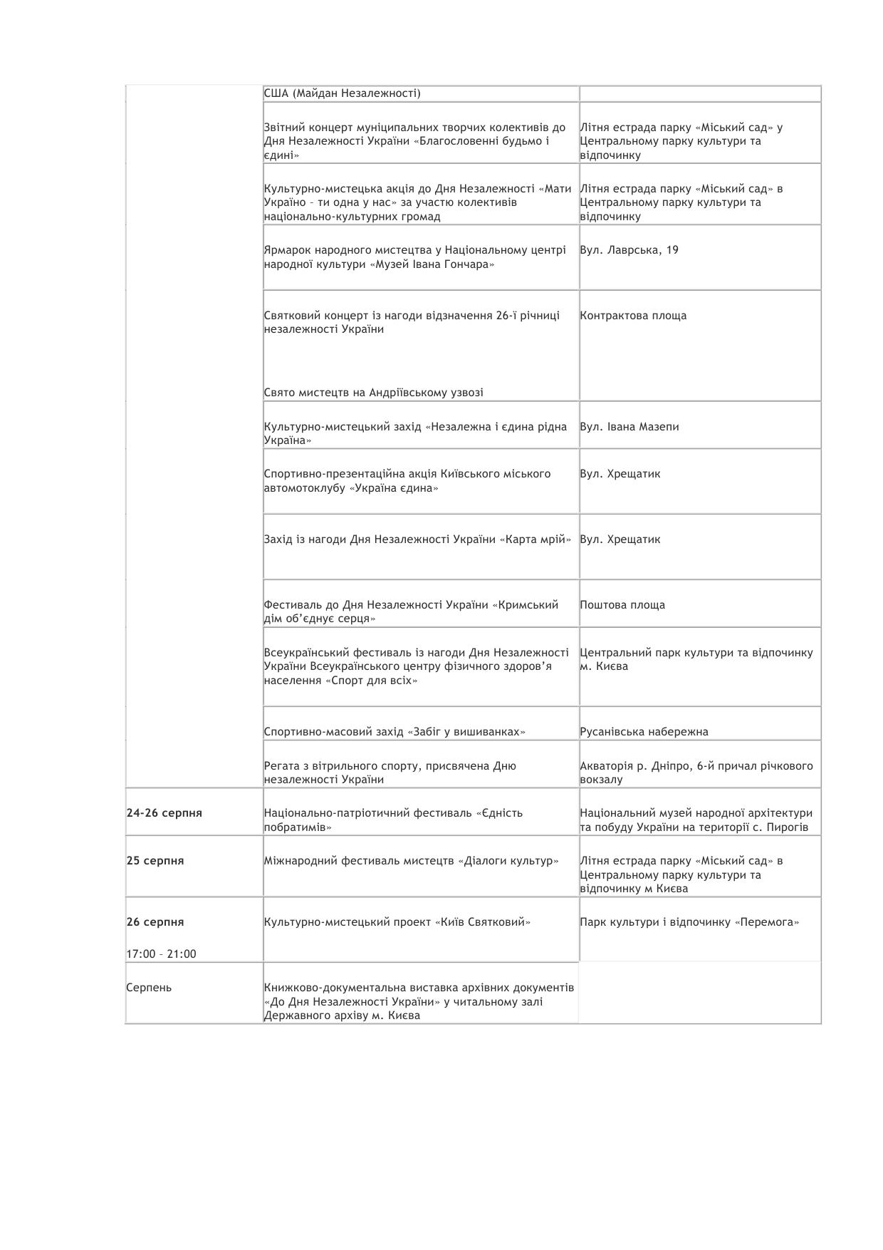 КМДА своїм розпорядженням затвердила план святкування 26-ї річниці Незалежності України, яким передбачена низка мистецьких і спортивно-розважальних подій.