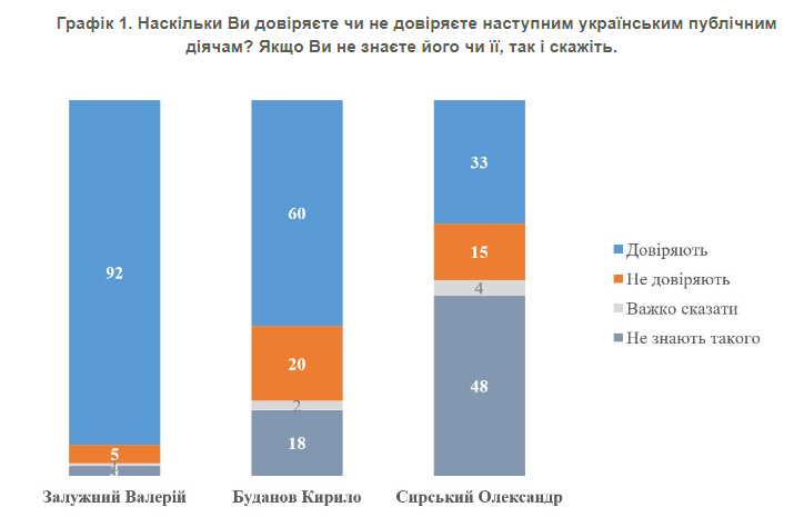 Водночас рівень недовіри серед тих, хто їх знає, становить 5% для Залужного, 24% – для Буданова, 29% – для Сирського.