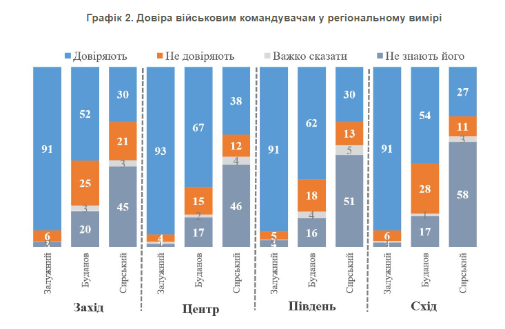 Так, серед усіх респондентів 92% довіряють головнокомандувачу Збройних сил Валерію Залужному, 60% – начальнику Головного розвідувального управління Міноборони Кирилу Буданову (хоча 18% не знають його), а 33% – командувачу Сухопутних військ України Олександру Сирському (але 48% не знають його).