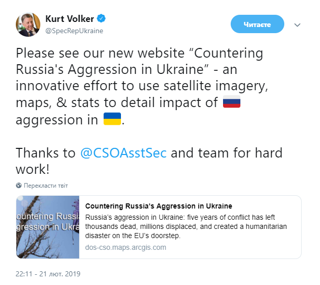 "Наш новий сайт "Протидія російській агресії в Україні" - інноваційна спроба використовувати знімки з супутників, карти та статистику, щоб деталізувати наслідки російської агресії в Україні", - написав Волкер.