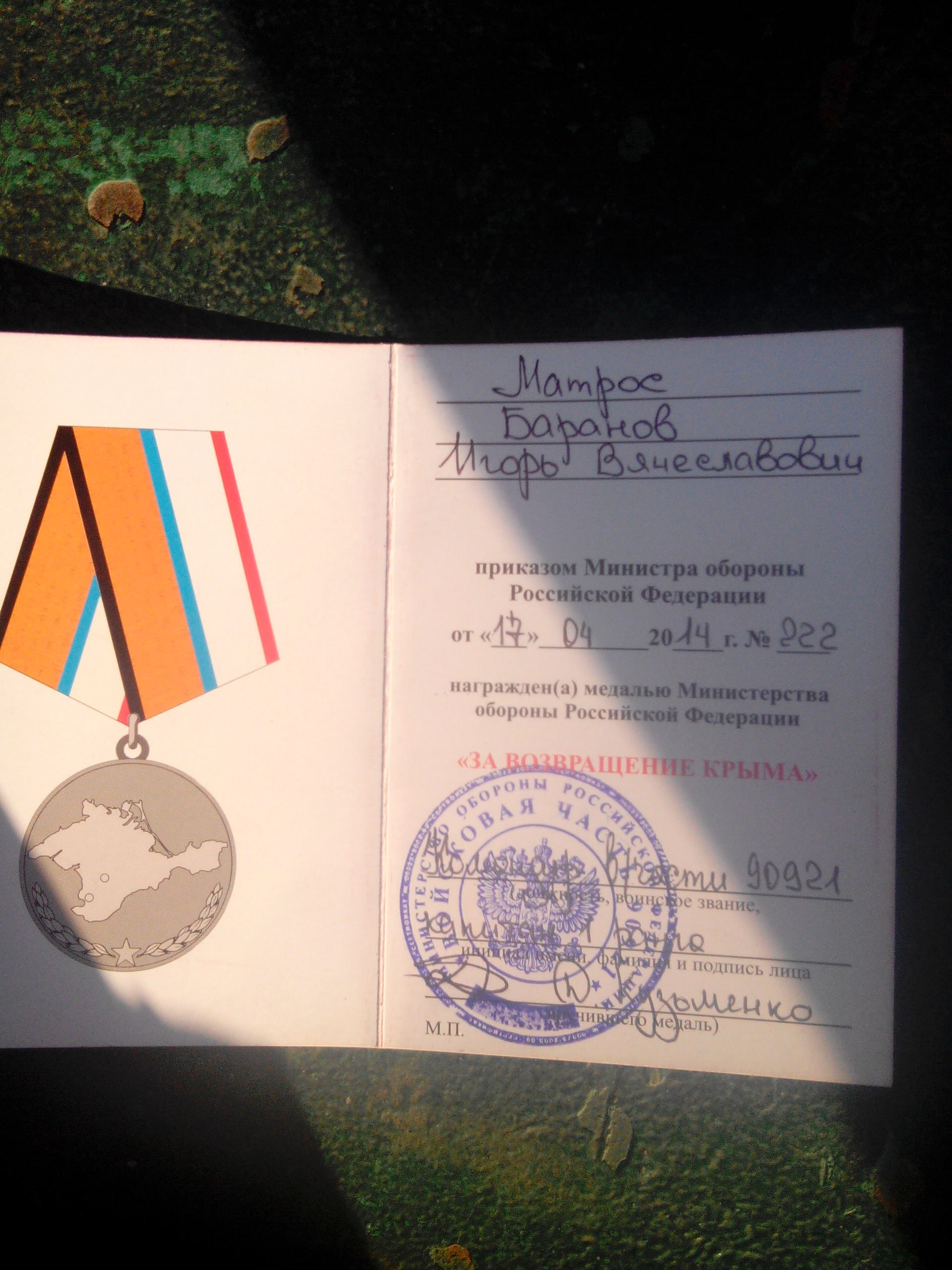 У посвідченні до медалі вказано чимало важливої інформації: повне ім'я та військове звання російського військовика; ім'я та звання командира бригади, який підписував нагородні документи і під чиїм командуванням моряки брали участь в агресії проти України; номер військової частини; номер та дата наказу МО РФ про нагородження – № 222 від 17 квітня 2014 року.