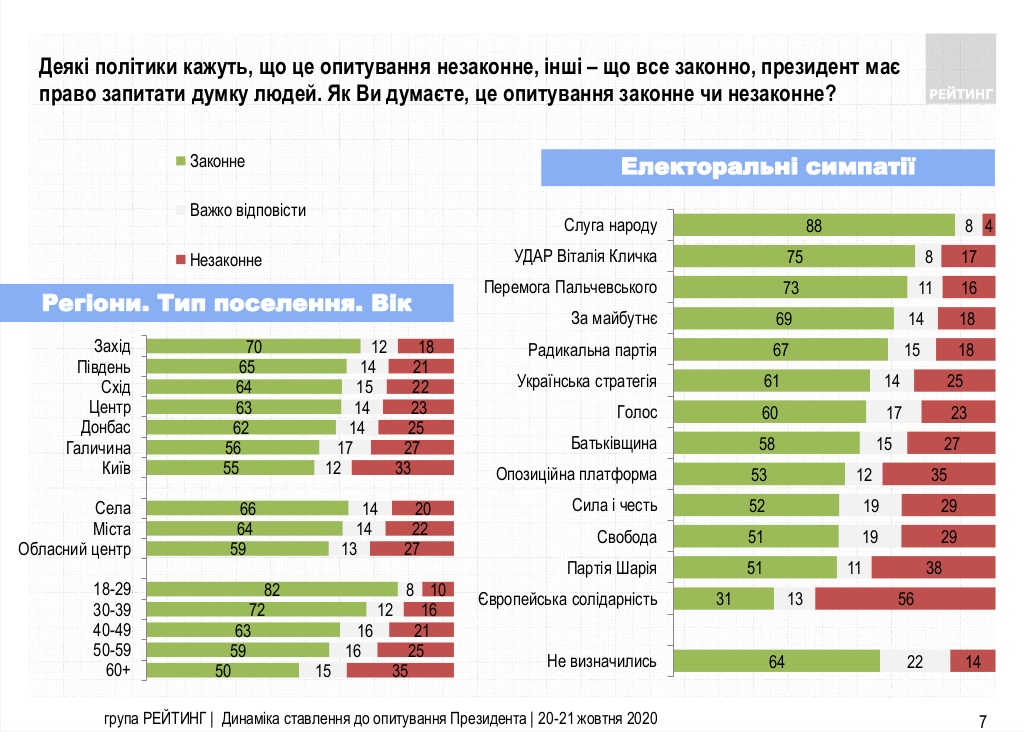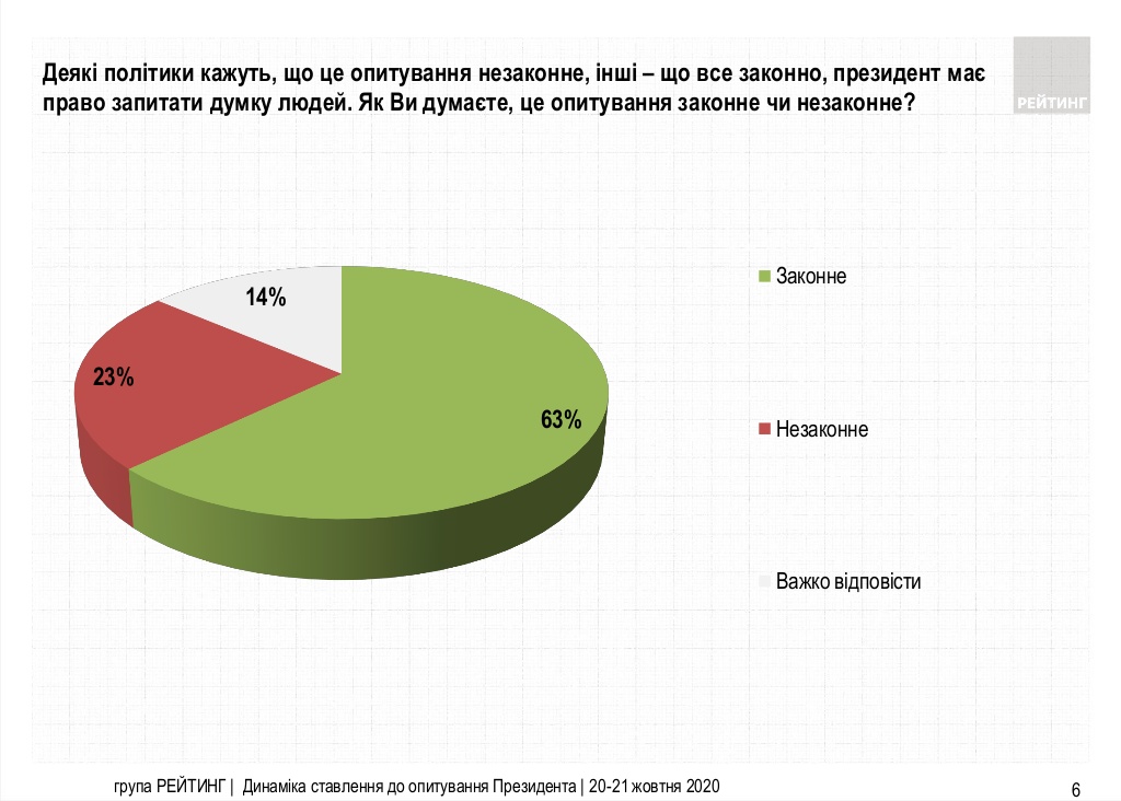 Також 63% громадян розповіли, що вважають “всеукраїнське опитування” законним. Протилежної думки притримуються 23% респондентів. При чому незаконним опитування Зеленського у своїй більшості вважають лише прихильники “Європейської солідарності”. Виборці інших партій у своїй відносній більшості вважають опитування законним.