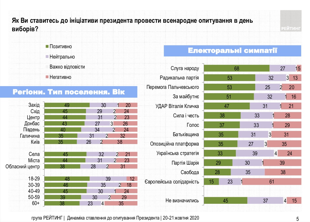 Відносно гірше ставляться до ідеї Зеленського кияни та жителі Галичини, старші опитані, виборці партії “Європейська солідарність”. Позитивно цю ініціативу сприймають молодші опитані та симпатики партії “Слуга народу”.